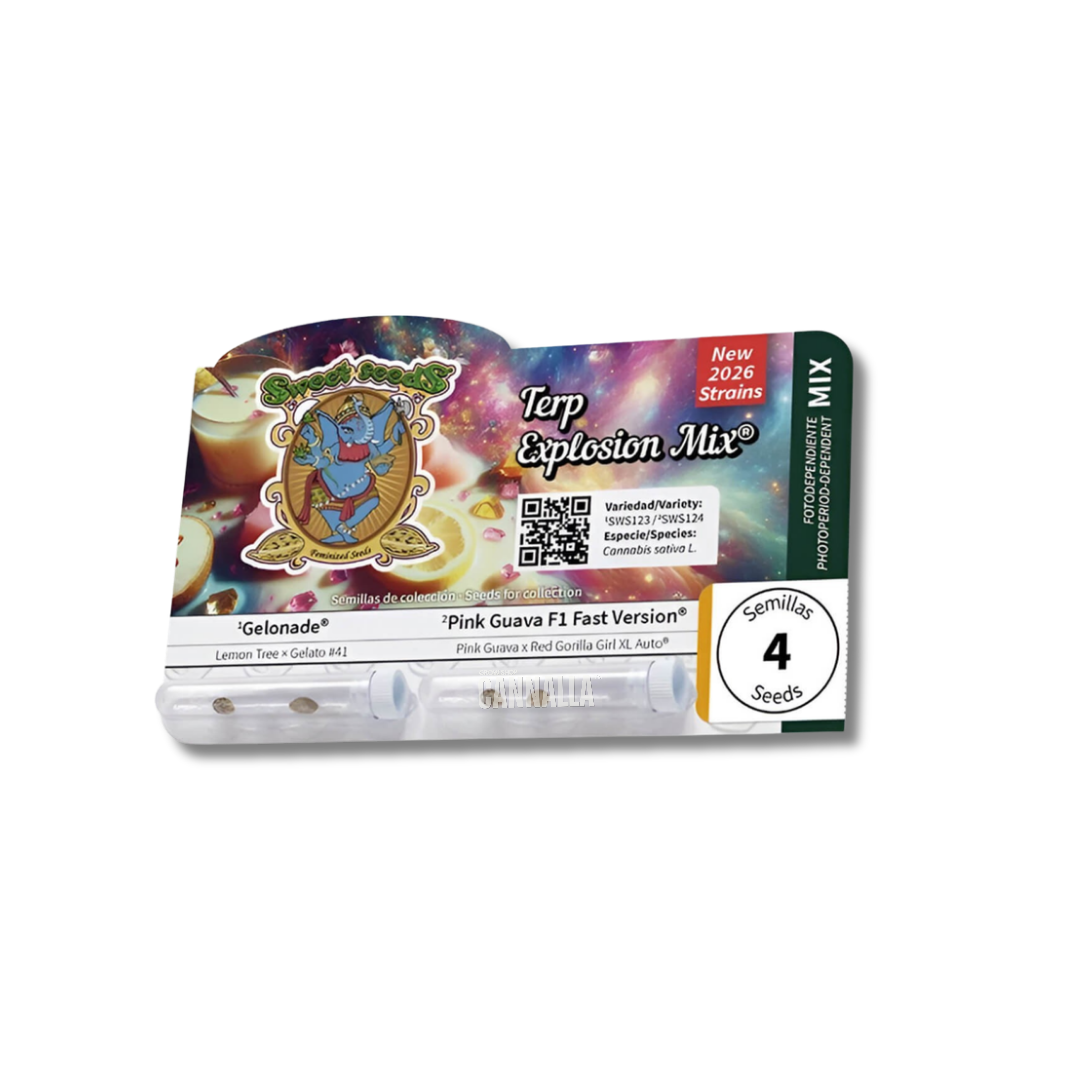 Terp Explosion Mix® de Sweet Seeds fusiona dos variedades fotodependientes del más alto nivel: Gelonade® (SWS123) y Pink Guava F1 Fast Version® (SWS124). Han seleccionado los aromas y sabores más intensos del 2026, el perfume de estas variedades debería ser declarado patrimonio sensorial de la humanidad.